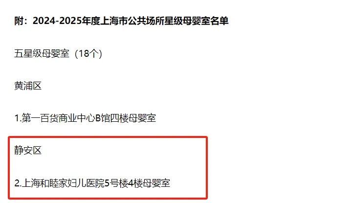日前,2024—2025年度上海市公共场所星级母婴室名单出炉。其中,上海和睦家妇儿医院5号楼4楼母婴室被评定为五星级母婴室,也是静安区唯一一家入选五星级名单的公共场所。