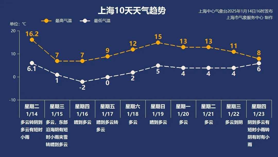周四周五,上海受冷高压控制,天气晴好,气温偏低,全天气温不足10℃。周四早晨的气温为本轮冷空气影响下的最低值,市区最低气温零下2℃到零下1℃,有薄冰,郊区零下7℃到零下4℃,有冰冻或严重冰冻。