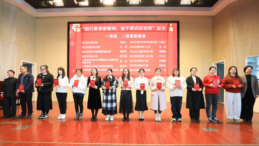 为加快建设教育强国、大力弘扬教育家精神,激励广大中小学、幼儿园教师以教育家精神为指引,以人民教育家于漪为榜样,2025年1月15日下午,“践行教育家精神,做于漪式好老师——2024年松江区青年教师读书征文和TED演讲比赛总结大会”在上外云间小学东校举行。市教委人事处副处长张瑾,区委宣传部副部长、区文明办主任沈茜,中山街道党工委副书记、办事处主任潘宏凯,区教育工作党委副书记冯雷,团区委副书记朱佳乐,市教师教育学院于漪教育教学思想研究部副部长兰保民,《上海教育》杂志执行主编计琳,区教育学院院长钱秋萍、党委书记陈赣,区教育局和教育学院部分班子成员出席活动。各学校分管师训领导、青年教师代表及参赛教师代表共同参与本次活动。