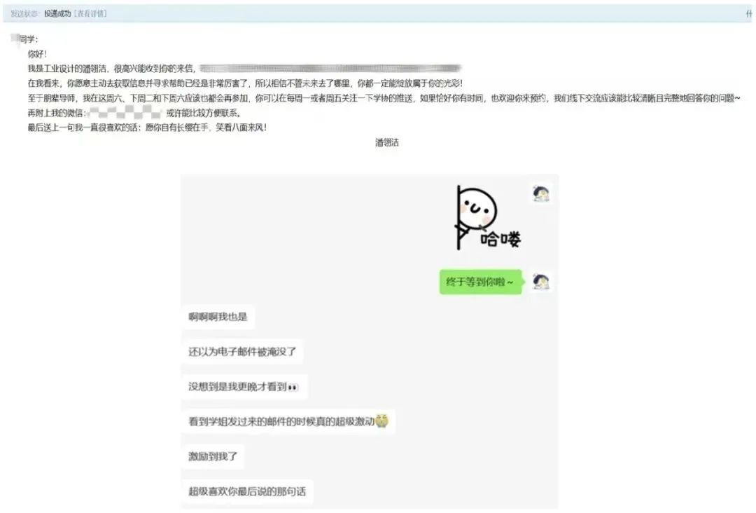 繁重的课业外,还要挤出时间整理经验分享,偶尔也会感到疲倦。直到有一天她收到了一封邮件“学姐你好!我对目前的时间安排和未来规划有些迷茫,正好看到朋辈导师,这个活动中有你……”一位学妹专门找教务老师询问了她的邮箱。“我当时特别感动,没想到自己居然会受到如此肯定。”后来她和学妹建立了联系,交谈甚欢。