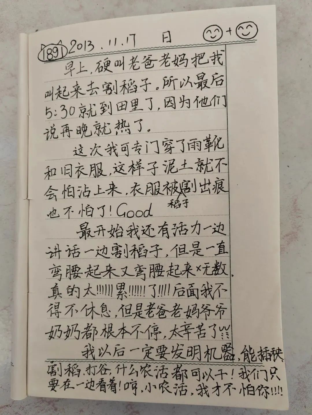 “当我六点半爬起来的时候,发现爷爷奶奶,早就已经到田里好久了。”“昨天看爷爷的手,上面全是裂纹。”记在日记里、疼在心里。潘翎洁在心中,种下了一颗种子:我要让干农活变得更轻松。她在日记里写道:“我以后一定要发明机器,什么农活都可以干!”