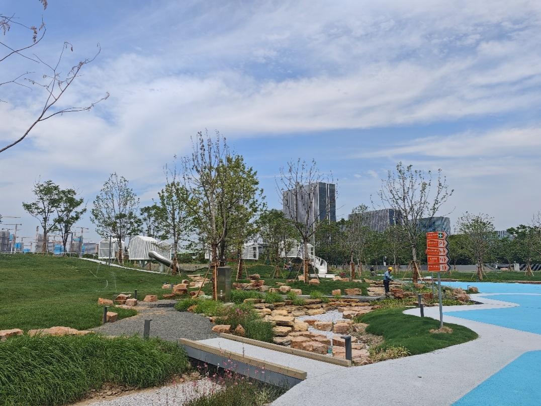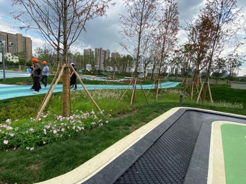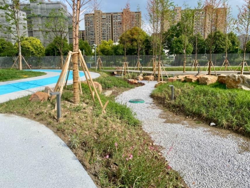 项目遵循生态优先的原则,充分应用“景观+海绵”的设计思路,将植物配置、竖向地形、铺装材料进行整合与拉通,实现海绵城市理念与景观空间的无缝衔接,提升场地雨水径流的就地消纳能力、减少地块雨水外排量,增强场地排水设计韧性,提高雨水资源利用效能,打造具有美学价值、自然有趣的海绵校园。