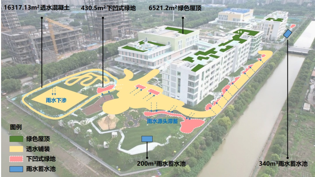 近年来,嘉定区积极推进海绵城市建设工作,深度挖掘在建和已建海绵项目特点,总结海绵校园经验和特色做法,在校园建设项目中引入“海绵城市”设计理念,持续推进嘉定“海绵校园”品牌建设。其中,上海市实验学校嘉定新城分校新建工程以自然融合的“景观+海绵”设计理念,入选2024年嘉定区海绵城市重点工程。