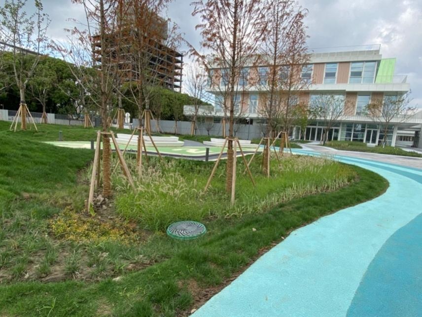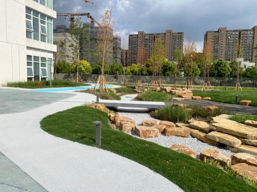 上海市实验学校嘉定新城分校新建工程以生态总控的管理模式协调整合各个专业,多方面考虑了建筑、铺装、植物与海绵的融合关系,充分利用“渗、滞、蓄、净、用、排”等多种技术措施,将海绵环境作为场地景观重要元素,提升整体空间景观效果,改善整体空间微环境,科学、合理地建设出具有美学价值的生态海绵景观,实现了场地雨水的自然积存、自然渗透和自然净化。