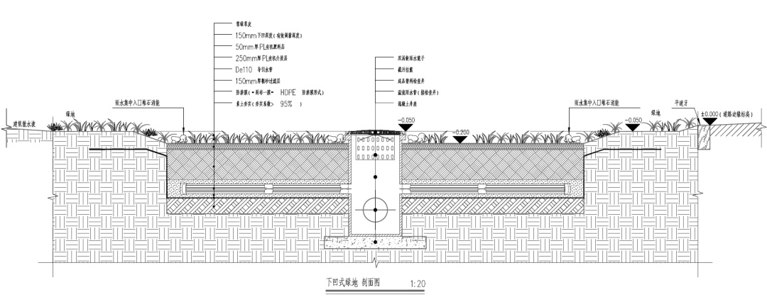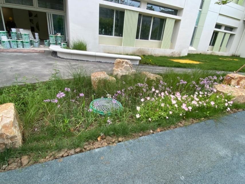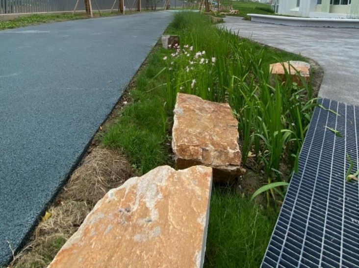 项目沿路分散设置共计430.5平方米的下凹式绿地,通过微地形设计收集周边道路场地雨水径流,收集的雨水通过内部种植土过滤、净化后下渗,超标雨水通过设施内溢流雨水井排入室外雨水管网。巧妙地将景观设计中的“旱溪”与海绵城市设计中的“下凹式绿地”结合起来,考虑植物花期、色彩、形态、质地、季相等搭配,构建了耐水湿的常绿海绵植物花境,保证下凹式绿地的观赏性。