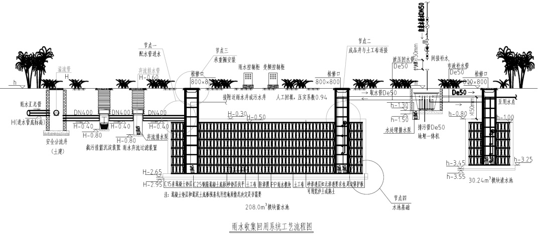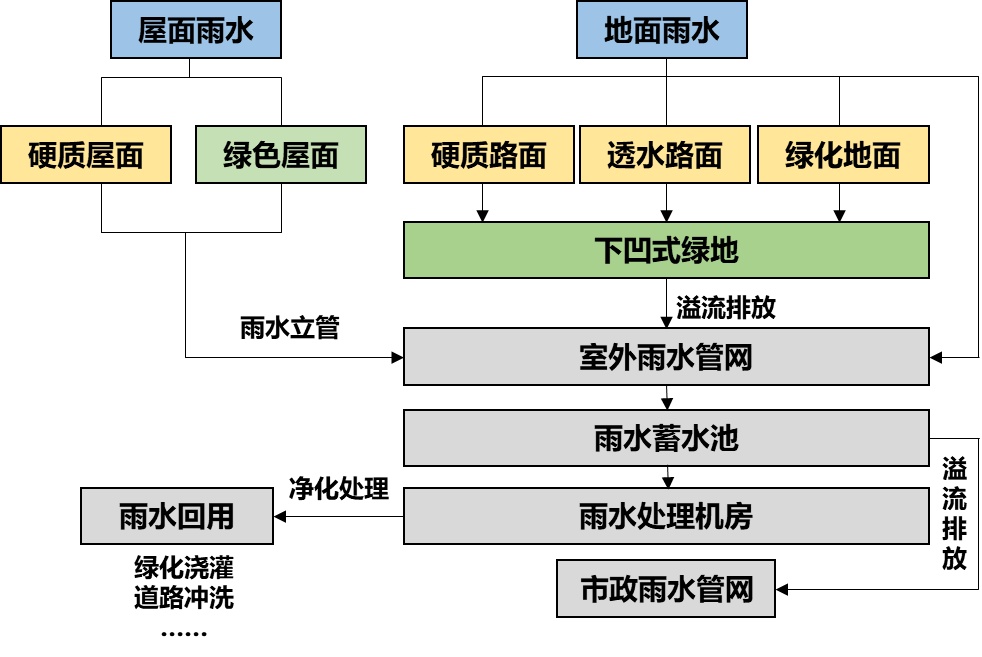 项目西地块设有1处有效调蓄容积为200立方米的雨水蓄水池,东地块设置1处有效调蓄容积为340立方米的雨水调蓄池,2个雨水调蓄池均位于地块雨水管网末端,兼顾雨水调蓄与回用功能,收集雨水处理后回用于场地绿化浇灌等杂用。西地块雨水资源利用率可达26.52%,东地块可达31.62%。