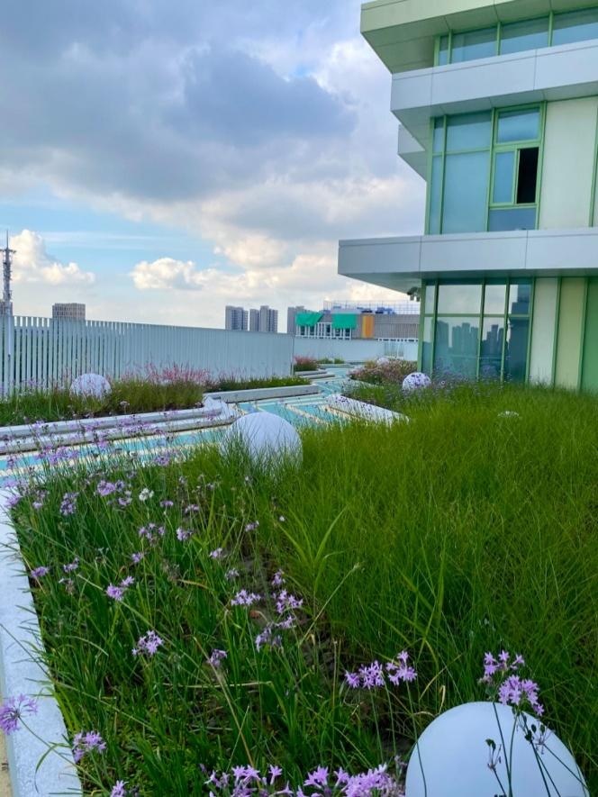 项目共计设置6521.2平方米的绿色屋顶,占建筑屋面总面积的30%,不仅可以吸收、削减雨水径流,减轻排水管网压力,还可以改善区域微气候环境,缓解热岛效应、降低周围环境的噪音污染。搭配儿童游乐设施的绿色屋顶成为了师生课间休闲放松的天然氧吧,为学校师生提供了更健康的学习生活环境。