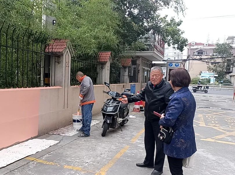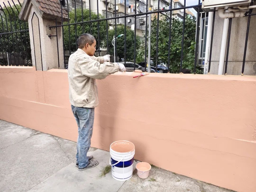 为解决墙皮褪色老化的问题,宝城新村居民区党总支在详细了解墙体的情况后,立即安排物业工作人员给出施工方案并实施。为确保刷漆施工质量,先拿铲子清理掉墙面上翘起的墙皮、用刷子清理掉墙面上的灰尘,对原有漆面进行打磨清理,再用腻子粉将脱落的墙面补平,刷上两层底漆进行防腐处理,最后涂刷面层漆。
