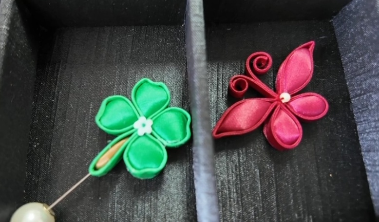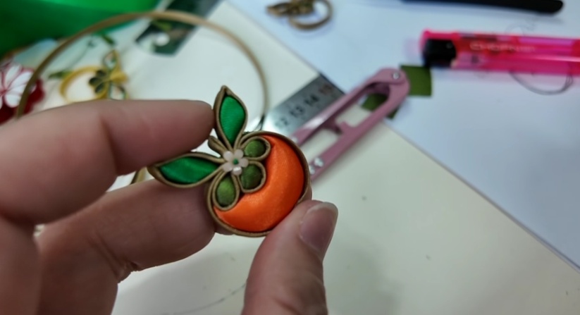 开料、刮浆、烫条、盘扎、扭转调型……做好的扣条经过一系列工序,逐渐变成一个结实圆润的扣头,最后再使用棉花填充固定,一枚精致的“柿柿如意”盘扣便制作完成。袁爱华介绍,此次盘扣胸针采用古法与现代技法相结合的制作方式,对不擅长针线的年轻人十分友好。