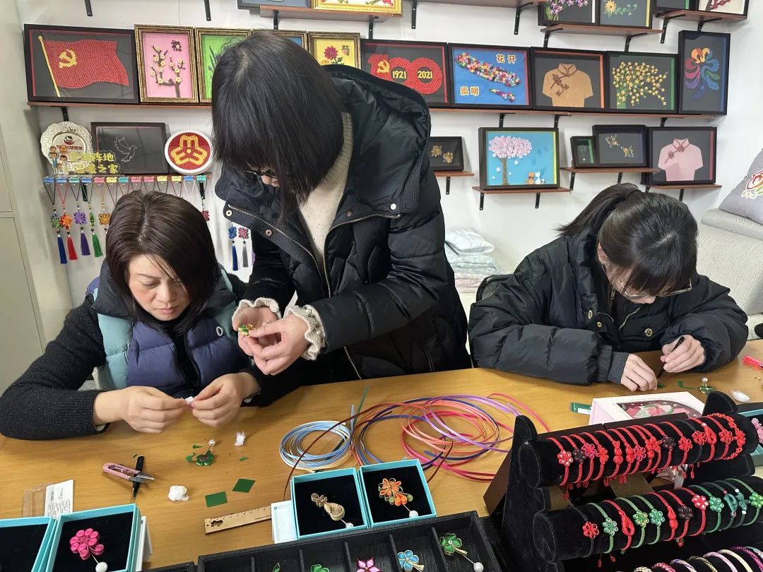 走进袁爱华盘扣工作室,各式各样的手链、胸针、盘扣画等随处可见。在袁爱华的精心指导下,学员们正全神贯注地尝试着盘扣新样式,寓意吉祥的柿子扣、寓意福禄的葫芦扣、寓意幸运的四叶草扣等新样式,让人眼前一亮,还有融入蛇年元素的盘扣手链,为新春增添满满喜庆氛围。“在忙碌的工作之余,能静下心来做手工,让时间慢下来,是一种很不错的体验。”学员吴俊丽说。