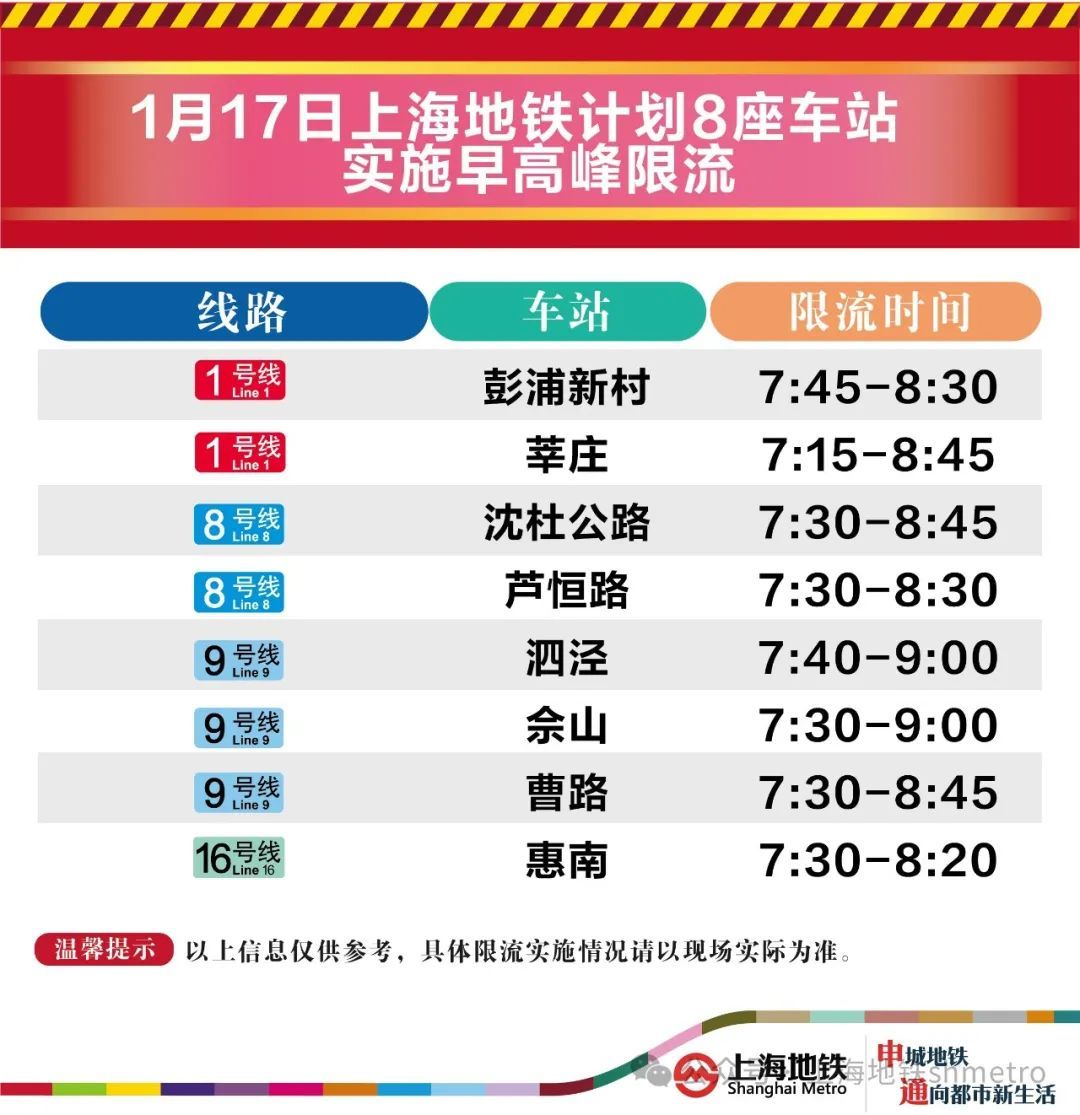 1月17日早高峰沈杜公路、芦恒路等8座地铁站计划限流