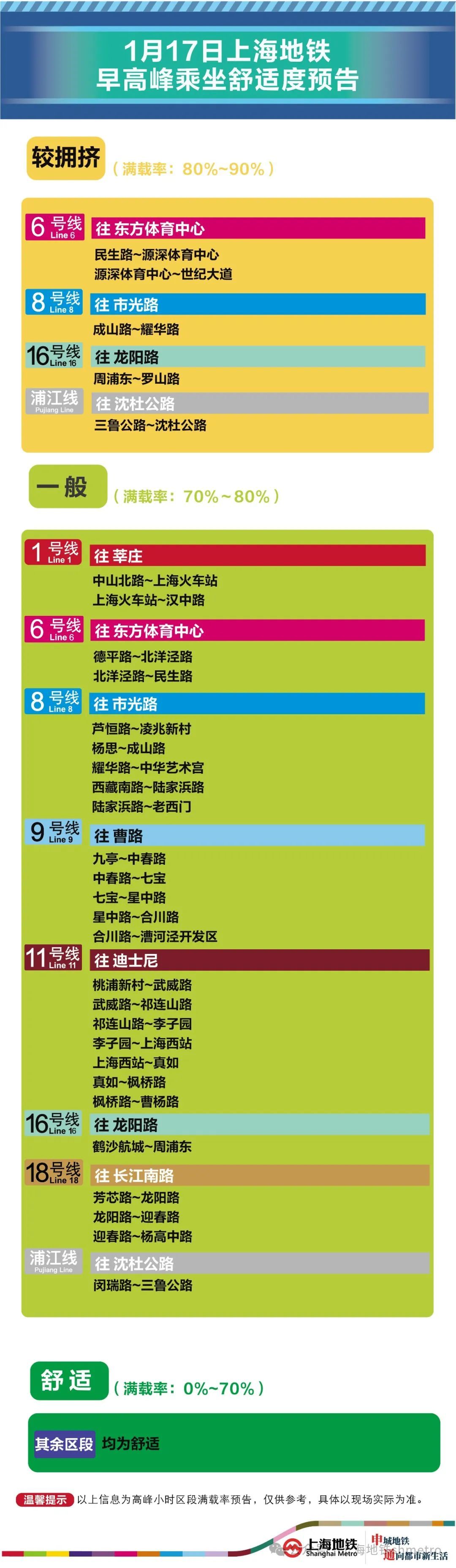 为提升上海地铁早高峰期间出行服务水平,提升乘客乘坐体验,上海地铁向乘客提供乘坐舒适度预告,方便乘客提