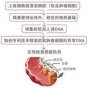 粪便核酸(DNA)检测是目前诊断结直肠肿瘤的前沿技术,其生物学基础是细胞脱落现象的持续存在。正常成人每天都会有上皮细胞脱落至肠腔,并随粪便排出体外,而结直肠肿瘤细胞由于快速分裂和对基底膜黏附性降低等因素,会持续不断地脱落到肠腔中,从而可以从粪便中提纯和分析肠道肿瘤脱落细胞的基因成分并以此判断肠道肿瘤的发生情况。