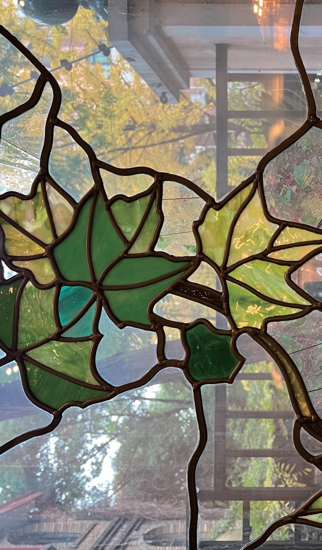她巧妙地选用了这个区域最具代表性的法国梧桐叶片作为主元素,为三樘玻璃窗设计了春夏秋三季具有特色又相互关联的景致。这个作品很大程度上,彭阳还融入了她对中国东方哲学的理解,颇有几分现代版“道法自然”的感觉,也有人与自然和谐共生的味道,令人心灵放松,打开一个想象的空间,如梦似幻。
