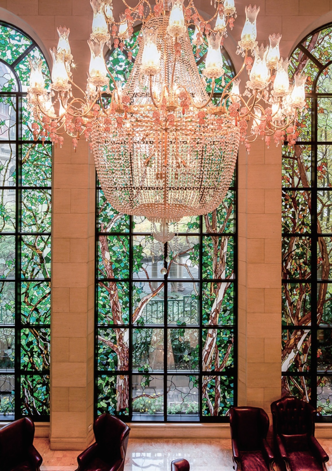 说起来,这个设计还源于一个偶然。彭阳是克勒门文化沙龙的一员,经常参加海派沙龙下午茶,马勒别墅2号楼大厅是喝咖啡的好场所,这个很有故事的历史保护建筑使“克勒门”的一群文化人流连忘返,当酒店想要装饰这三樘大窗时,自然找到彭阳出主意。马勒别墅是她从小就熟悉的建筑,能够亲自为它设计玻璃,对彭阳而言,无疑是莫大的喜悦,仿佛是给一位老朋友量身定做设计,满载着自己童年的回忆和情感。