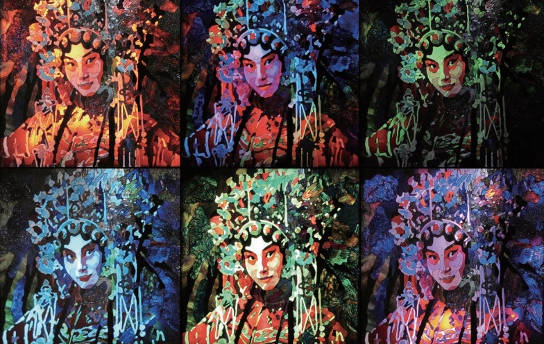 《京剧脸谱·杨贵妃》玻璃艺术作品在灯光闪烁下呈现出不同的艺术效果
