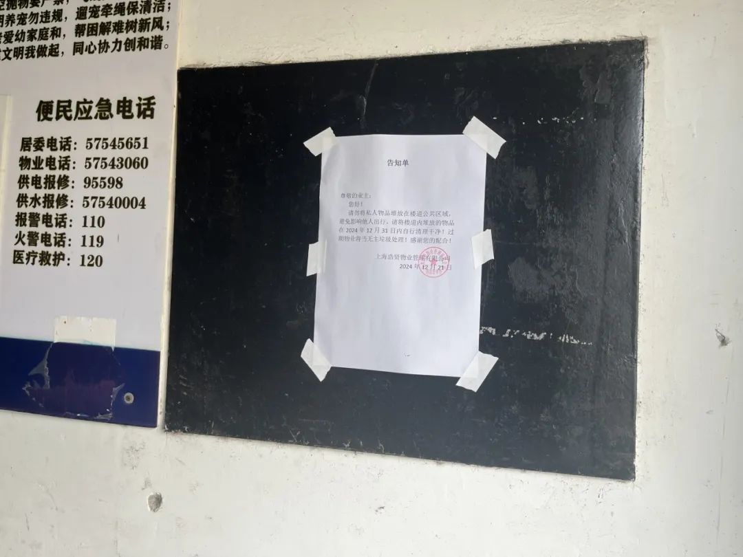 整治前期,居委会和物业提前通过线上创建微信群、线下张贴《楼道清理告知书》等方式加强宣传,引导动员居民们自行清理。