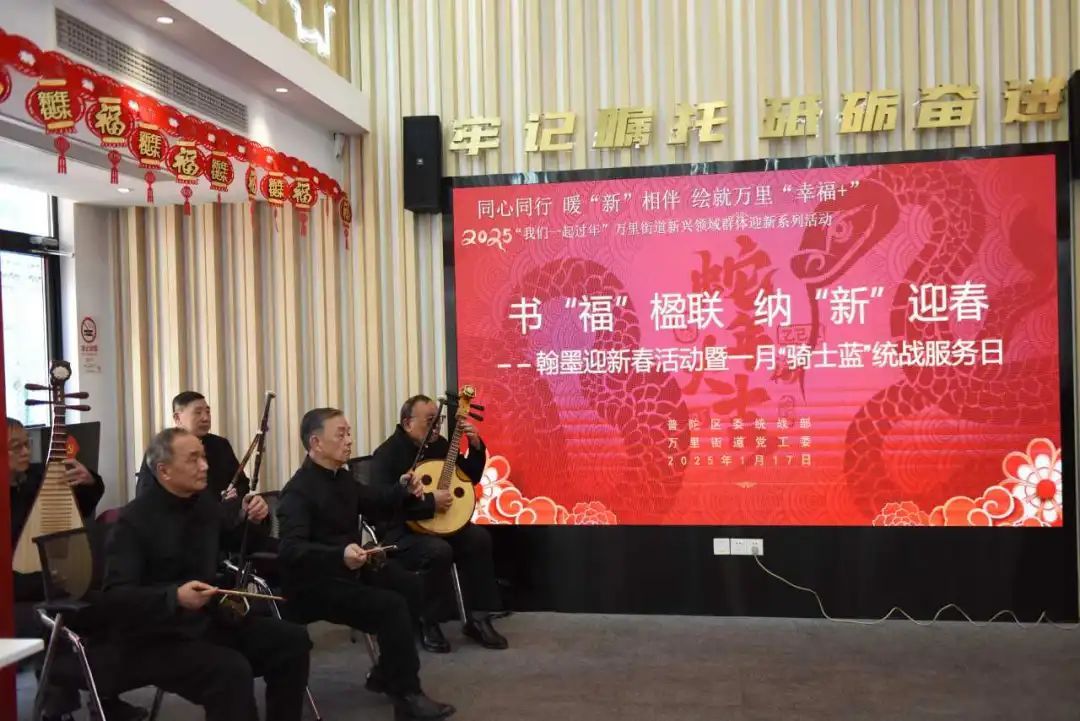 万里民乐队现场演奏传统喜庆的新春曲目,用美妙的旋律欢度春节,让新兴领域群体体验到了别样的年味。活动现场,还提供安业就业咨询服务。