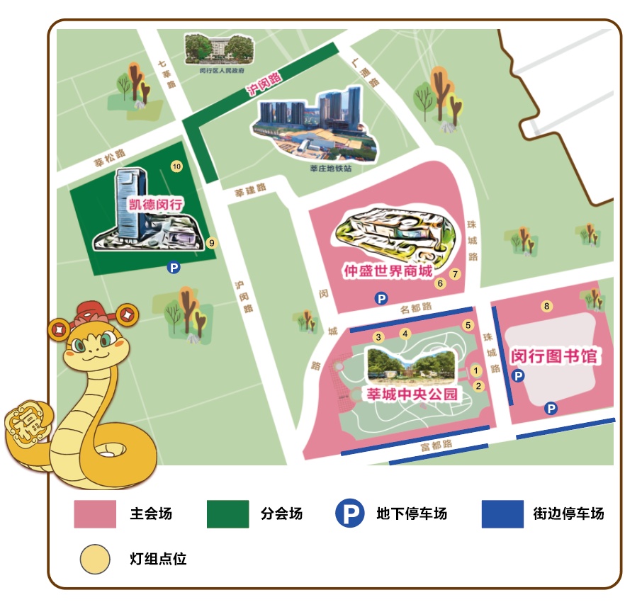 最近,不知道大家有没有在路上偶遇过一辆标有莘庄灯会标识的闵行21路公交巴士?随着新春佳节的临近,南上海最大的灯会——“2025年莘庄灯会”即将于1月26日拉开帷幕,各个点位的灯组也在火热搭建中。今年的灯会有哪些亮点呢?一起来抢先看! 亮点一 灯会主会场重回莘城中央公园 从2007年起,莘庄镇每年在元宵节期间举办主题游园活动。2017年,为进一步打造更具标识度的本土文化品牌,元宵主题游园活动正式命名为“莘庄灯会”,渐渐成为南上海的一张优质文化名片,灯会主会场从莘城中央公园扩展到了广场、商圈乃至主干道。 今年主会场重回大家记忆中熟悉的莘城中央公园,在莘城中央公园、仲盛世界商城、闵行春申文化广场间形成区域联动。届时,沿线道路将张灯结彩,一派火树银花不夜天之景。 亮点二 “猫和老鼠”来莘庄灯会游玩 看到以下灯组照片,除了今年的生肖“蛇”元素,你有没有发现其他特别之处? 没错!本届灯会首次邀请了华纳兄弟探索集团经典IP“猫和老鼠”来到现场,各式灯组将分散放置在莘庄仲盛世界商场、莘城中央公园、闵行区图书馆以及凯德闵行商业中心的广场上,方便来往的市民们赏灯游玩,打卡拍照。 目前,仲盛世界商城南广场的“画蛇添福”灯组准备就绪,“汤姆猫和杰利鼠”跃然灯上,莘城中央公园和闵行图书馆门前的灯组也已初见雏形。 灯会期间,仲盛世界商城还将推出以经典卡通形象“汤姆猫和杰利鼠”为主题的文创快闪店。这一快闪店将带来“猫和老鼠”&莘庄灯会等一系列限量版的周边商品,包括手提灯笼、冰箱贴、祈福挂饰等,市民在购物的同时,能够回味童年记忆,体验浓厚的节日氛围。 亮点三 “灯会巴士”上线,畅游闵行 今年,莘庄灯会特别推出了定制版闵行21路“莘庄灯会”巴士专列,它身披红色新衣,车窗也贴上了福字,车内还挂上了红灯笼,新春氛围拉满。 市民可以乘坐“灯会巴士”从莘庄出发,这条路线途经得丘园、航天科普馆、韩湘水博园、728忆空间、大零号湾图书馆等地,不仅涵盖了丰富的文化景点,还能让市民在赏灯的同时,体验到不同的文化氛围。 也许你会疑惑:巴士上的莘庄灯会的“莘”字下部为什么是个“羊”?这可不是印错了哦,是因为莘的楷书字体在书写时采用了篆书和隶书的结构,莘字的楷书在书写时,下部写作“羊”,这种写法多见于魏碑,柳公权也有此写法。 最后 附上今年莘庄灯会地图 市民可以提前安排好出游计划 来闵行莘庄一起欢庆新春佳节!