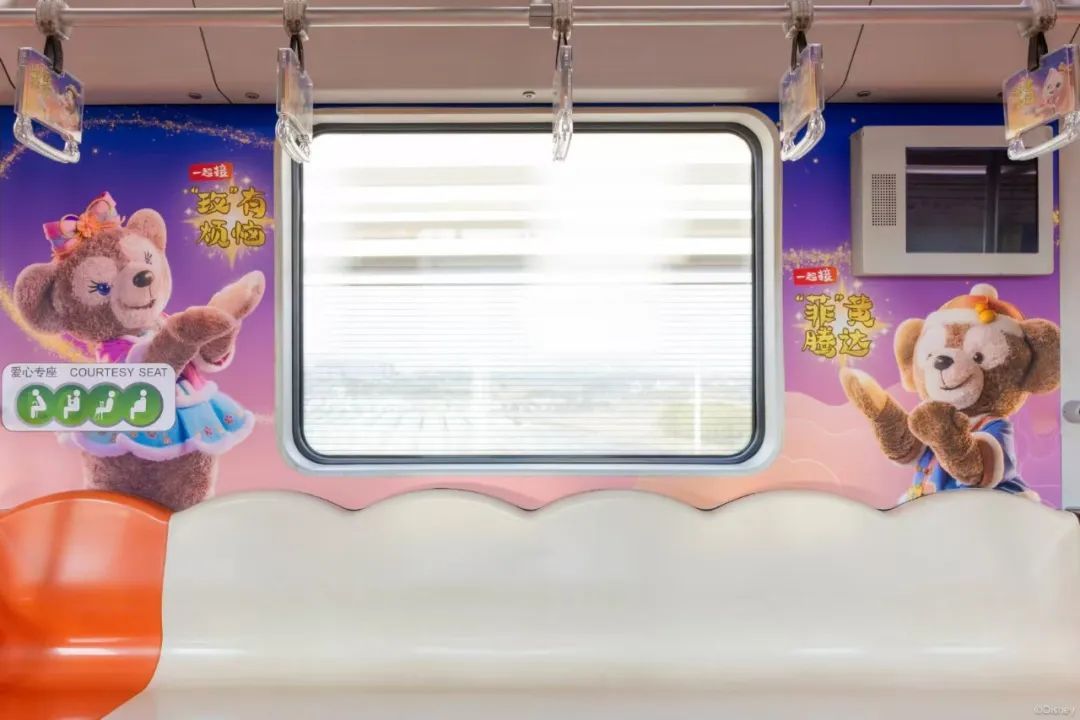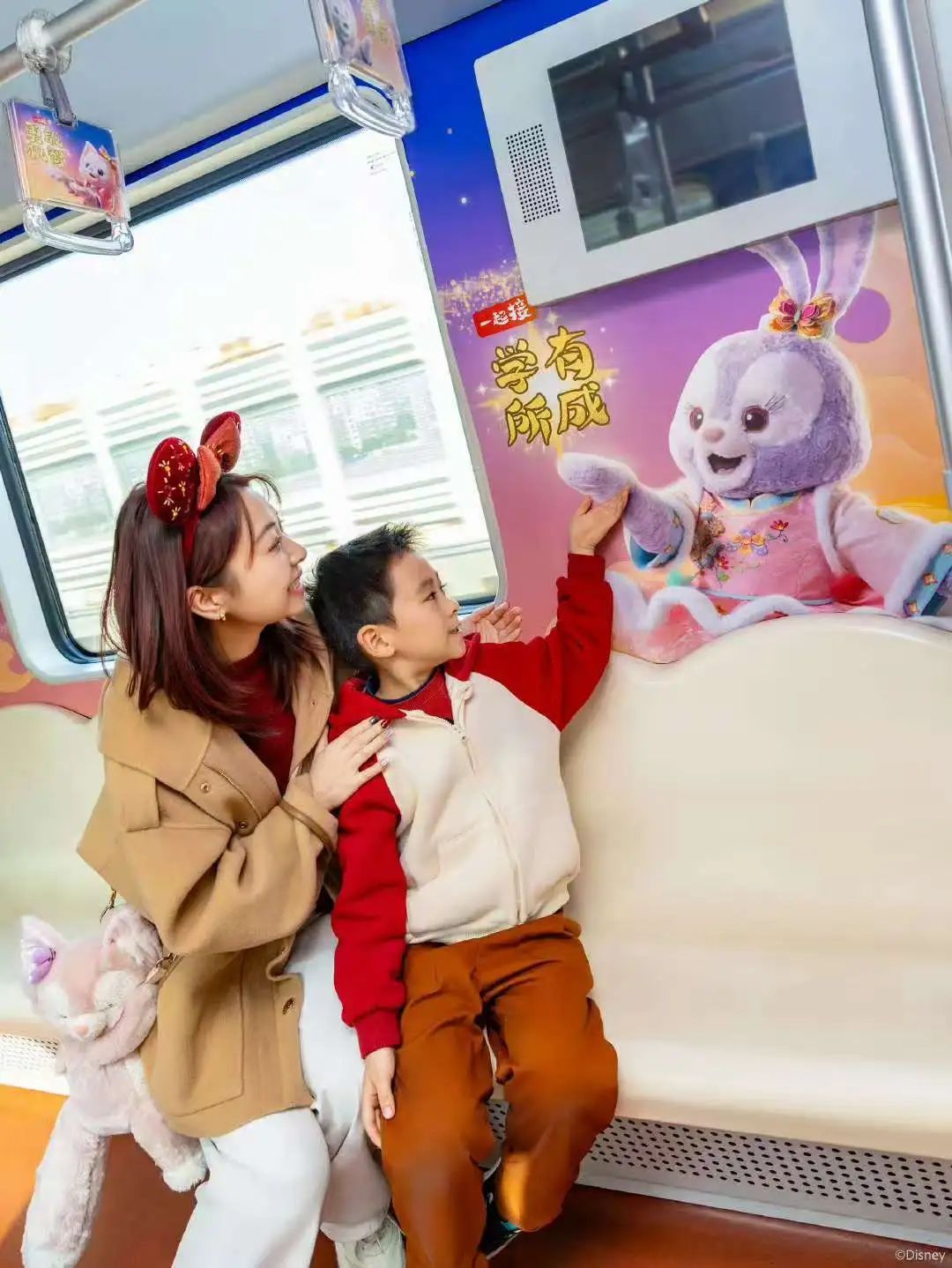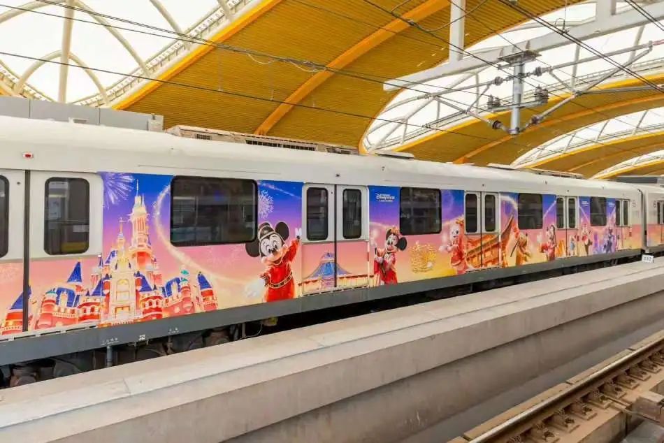 该专列的车身印有绚丽烟火下的迪士尼城堡、幻想曲旋转木马等上海迪士尼度假区游乐设施和挂着红灯笼的中国风建筑,还有身穿汉服正欢快起舞的米奇、米妮、高飞、布鲁托、玲娜贝儿和奇奇蒂蒂等备受游客喜爱的经典卡通形象,仿佛一座移动的“迪士尼乐园”。