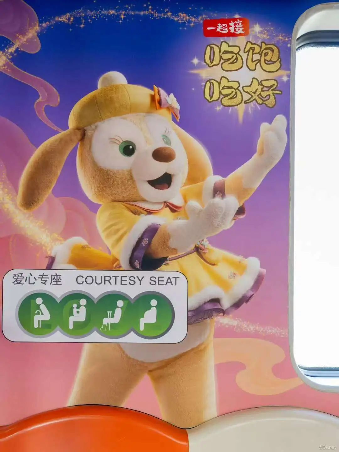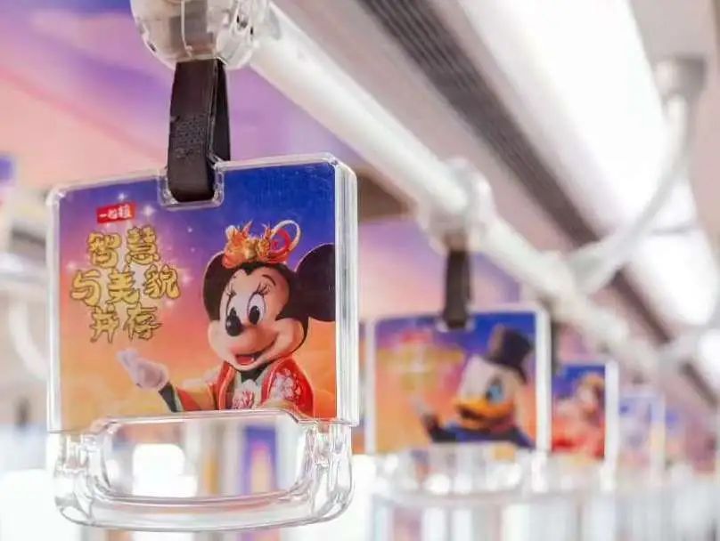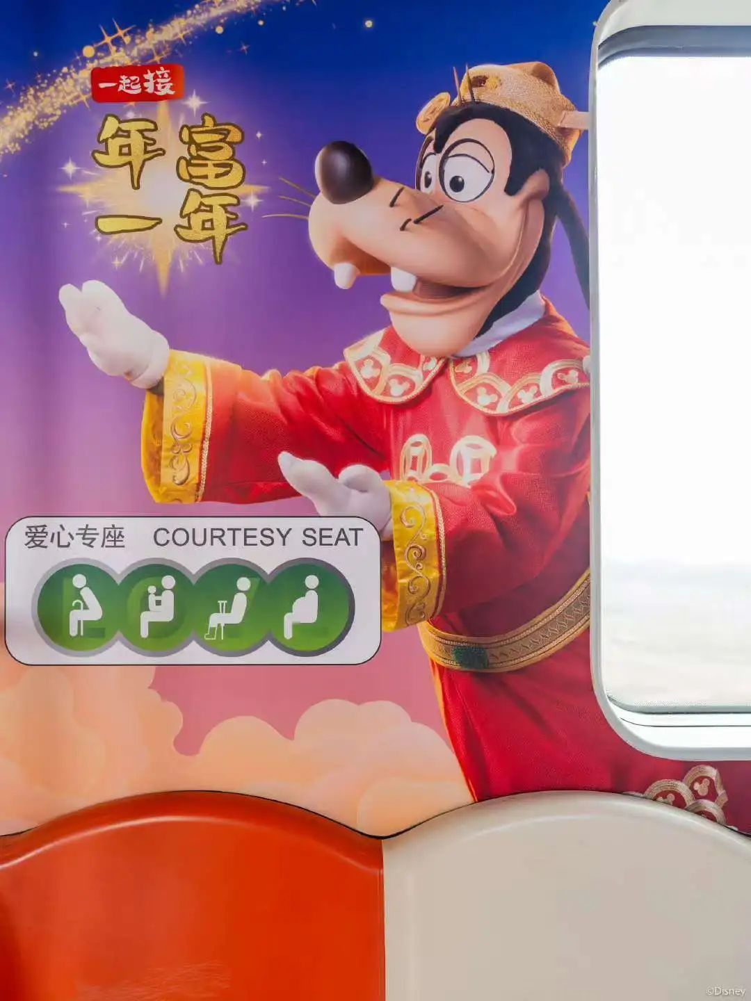 “登上奇妙专列,抓住把手,和朋友们一起接奇妙吧!”走进车厢内,可以看到其中装饰了新年主题的顶贴和侧贴海报,把手上还有不同迪士尼角色送上的祝福,如“嘎嘎开心”“智慧与美貌并存”“‘菲’黄腾达”“‘玫’有烦恼”等,既有趣又饱含美好祝愿。