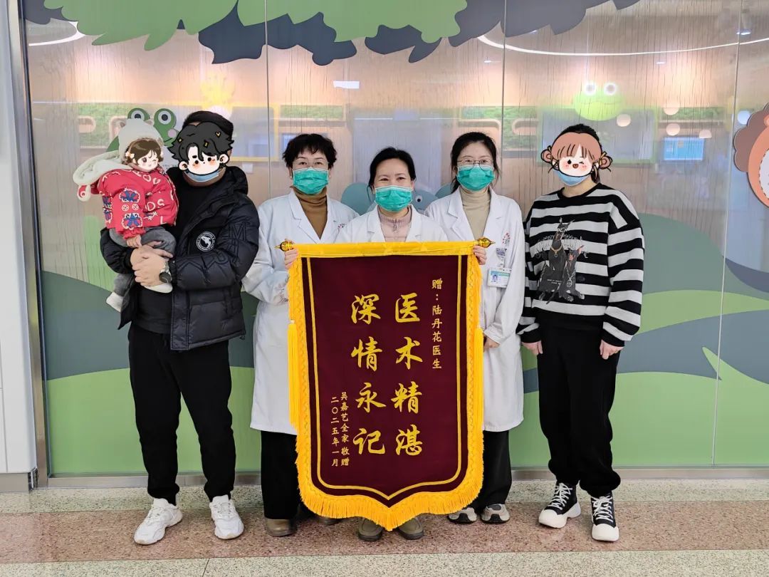 在小艺出院后,夫妻俩第一时间前往门诊感谢陆丹花医生并送上绣着“医术精湛,深情永记”的锦旗,感谢她用专业与爱心为孩子的成长之路点亮了希望之光,为他们家留住了欢声笑语与健康。