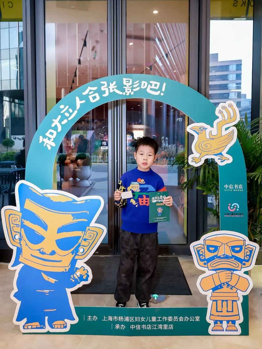 据悉,本次活动由杨浦区妇女儿童工作委员会办公室主办,中信书店承办。走进中信书店江湾里店,一层划分为阅读区、文创区、特色展区等区域,为青少年提供多样化的探索空间。本次活动共75组家庭参与,活动现场共设置“和大立人合影”、“寻找隐藏三星堆知识卡”、“特色VR体验”三个趣味环节。