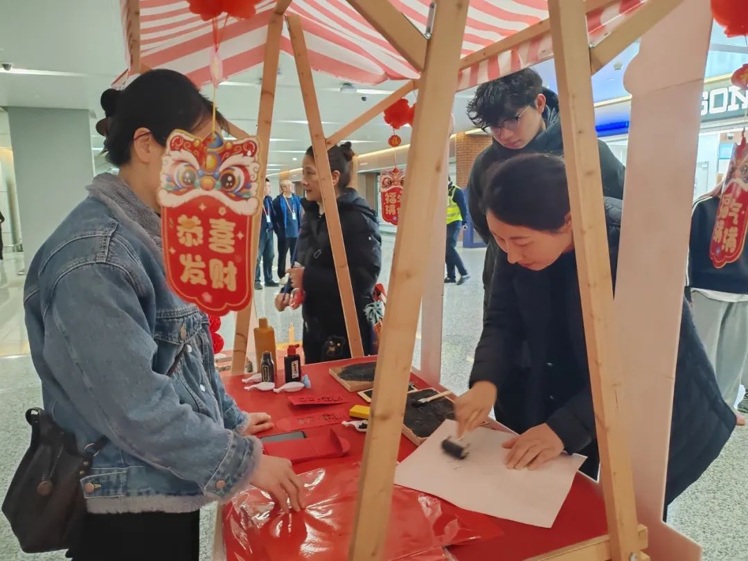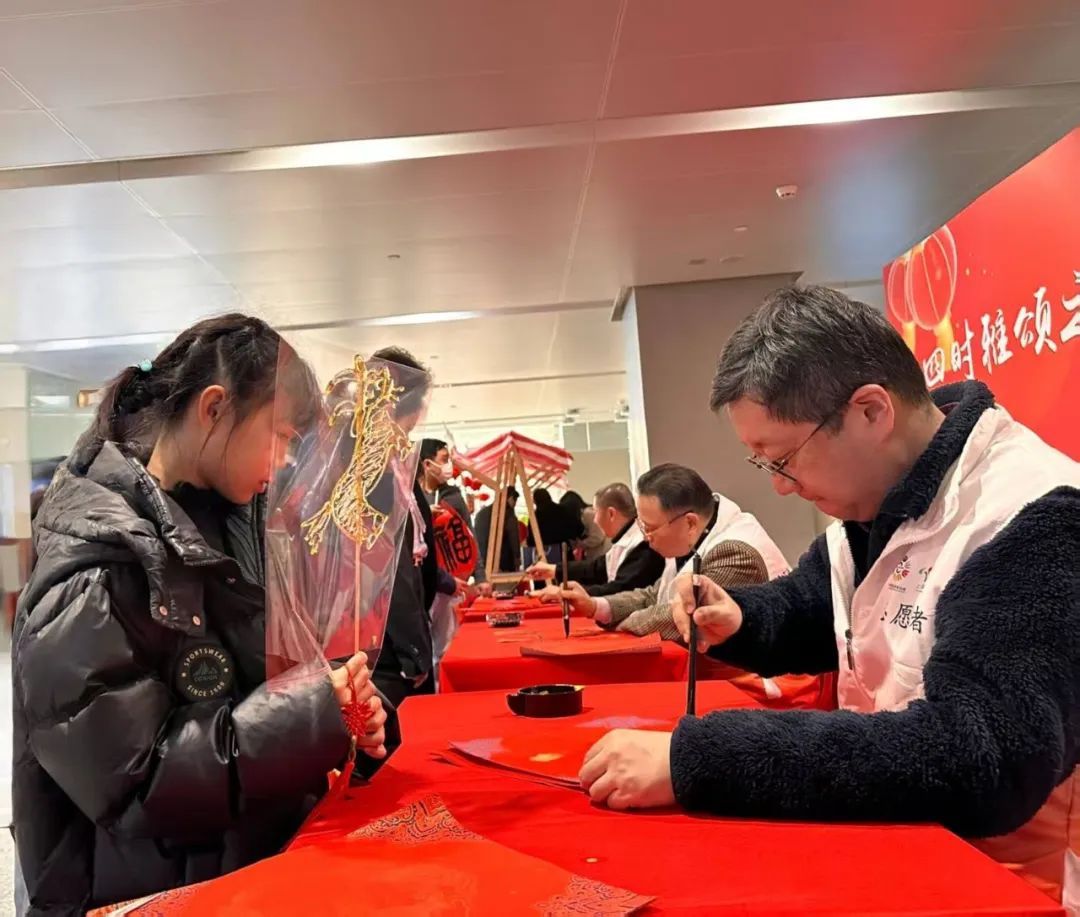 春节将至,贴春联是新春佳节必不可少的环节。在春联体验区,一张张“福”字从长宁区书法家协会的老师们笔下诞生,为虹桥机场增添了新年的“福”气和喜气。不少回沪的旅客们在此精心挑选,把美好的寓意带回家。