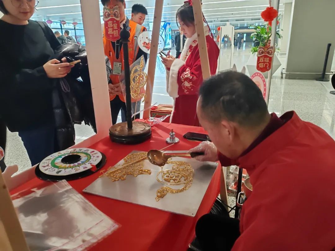 下午三点,虹桥机场1号航站楼已是一片红火。春联、糖画、木版年画、投壶、钓元宝……各式各样的传统文化活动吸引了众多旅客在此驻足。