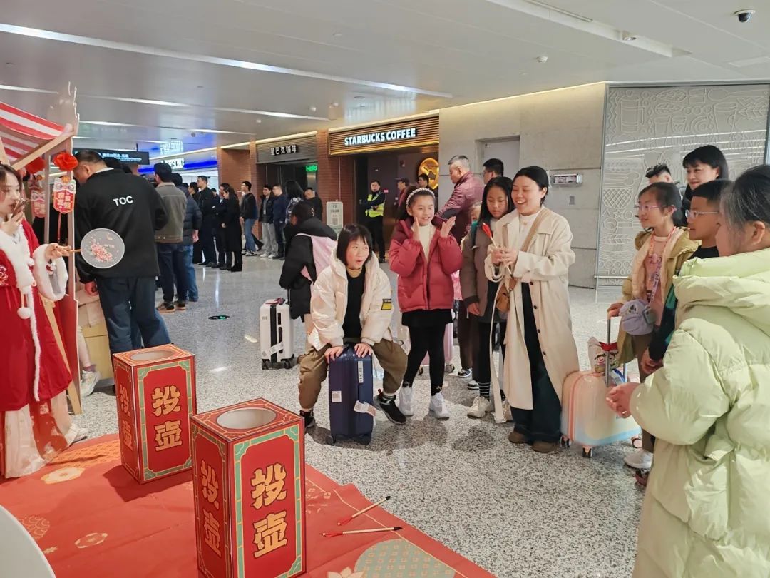 “再扔远一点……耶!我投中啦!”在古代,武人射箭、文人投壶是传统宴请中“射礼观德”的礼仪。而在今天,旅客们共同比试投壶,体验这一传统游戏,赢得新年奖品。钓元宝游戏则以垂钓的形式开展,小心操纵鱼竿勾起立牌,既考验眼力又锻炼手力。“我还想再玩一次!”新年的互动游戏,令刚下飞机的孩子们意犹未尽。“感觉特别热闹,很有新年的喜庆气氛。”旅客们笑着说。