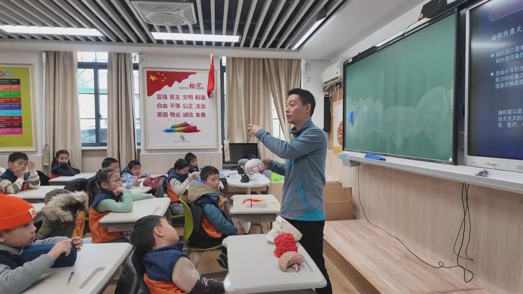 在课堂上,同学们听得津津有味,他们不时举手提问,展现出对脑机接口技术的浓厚兴趣。陈医生耐心解答同学们的每一个问题,引导他们思考科技与社会、科技与生活的关系。通过这次科普体验课,同学们不仅了解了脑机接口的基本原理和在医学上的应用,还激发了他们探索科技奥秘的热情。
