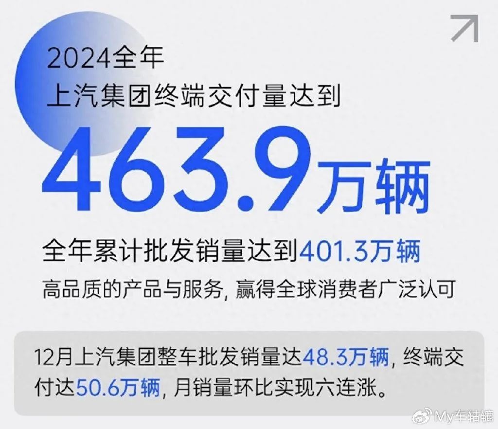 作为国内最大汽车集团之一,上汽集团在2024年加大创新力度与深度改革,通过战略优化、技术升级、组织架构调整等措施,实现了新产品、新技术的快速落地,并且整车销量连续6个月实现环比正增长。最新数据显示,上汽集团2024年终端交付463.9万辆。