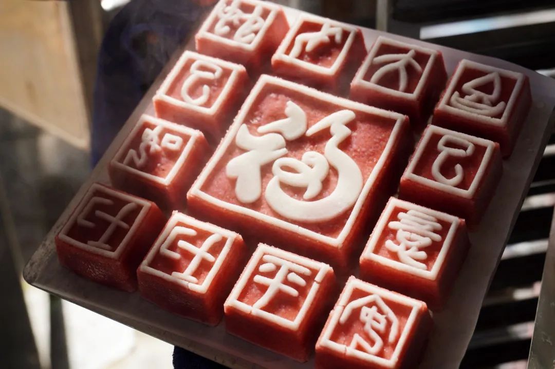 “你看,这是我们刚刚为新年设计的蛇年焋糕。”他兴奋地向记者展示刚出炉的“新宝贝”——一款红底白字的南瓜馅焋糕。四四方方的焋糕由一个大福字和12个小块组成,中间福字中的“田”被设计成小蛇的形状,展示着这是款蛇年生肖糕;四周的12块小方糕上,各有一字,别看这些文字歪歪扭扭难以辨认,这可是甲骨文!12个字分别是:蛇年大吉、事事如意、岁岁平安。