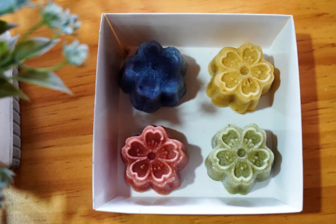 精心筛选过的大米和糯米经过浸泡,按照4:6的比例进行混合;想要呈现的颜色不一而足,蓝色用的是蝶豆花,黄色用的是南瓜,绿色用的是抹茶或者菠菜汁;馅料也并非单一,除了传统的豆沙、枣泥味外,还有核桃、南瓜、芝士等口味;还设计出新颖多样的模具,用于制作不同形状、不同用途的焋糕。