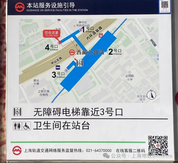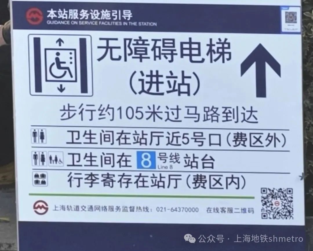四是增加服务设施方位指引。对临近无障碍电梯的出入口,直接使用箭头指引方位,并增加距离指示;新增车站卫生间位置指引,标注位于费区内或费区外,便于乘客选择;设置寄存柜的车站新增行李寄存指引。