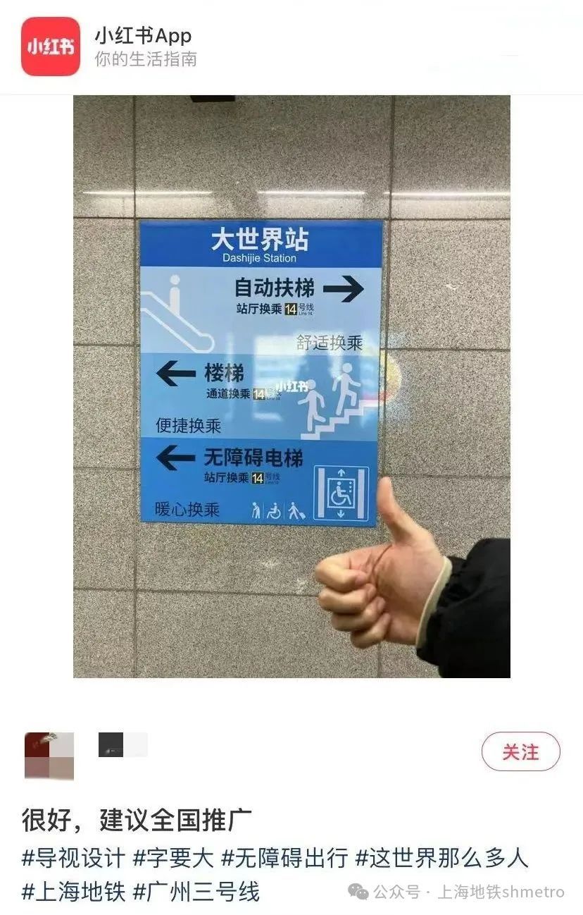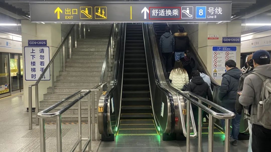 2024年2月,大世界站进行导向优化试点工作,新增换乘导向指引,通过舒适换乘引导乘客乘坐自动扶梯到达站厅,轻松舒适进行换乘;通过便捷换乘,引导乘客步行楼梯直接到达站台换乘,缩短换乘时间,为乘客提供更加清晰直观的换乘选择,获得了网友的点赞和好评。