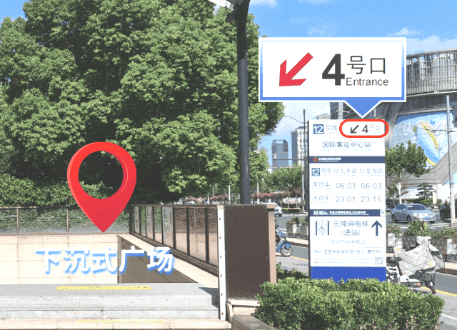二是下沉式广场精准引导。部分下沉式广场的站点入口不明显,乘客不易发现。对这类出入口,在地面设置综合服务信息牌,通过导向箭头更明确地指引乘客进站。