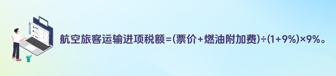 答:取得注明旅客身份信息的航空运输电子客票行程单的,按照下列公式计算进项税额:航空旅客运输进项税额=(票价+燃油附加费)÷(1+9%)×9%。