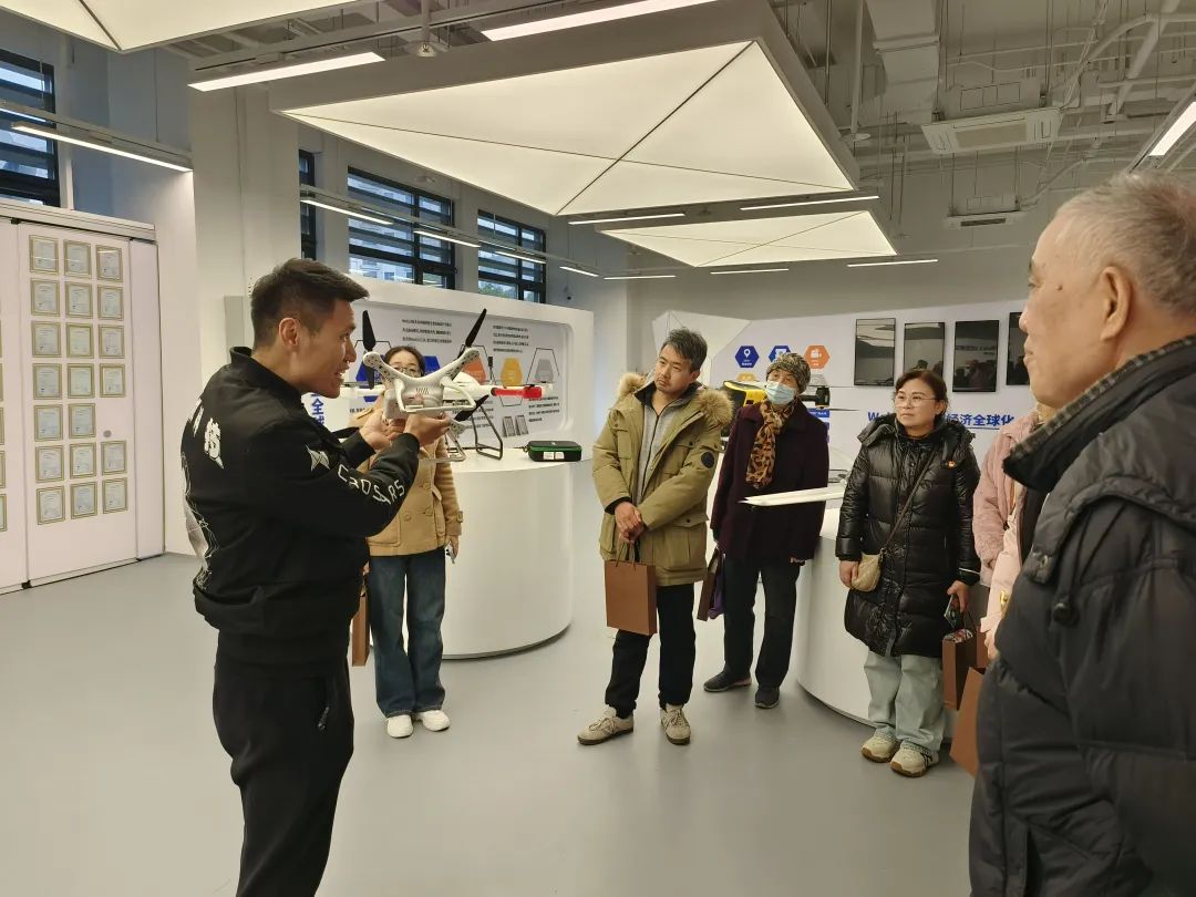 随后,参观者一行走进约500平方米的千机科技低空数字营销场景馆。在这里,由千机科技自主研发的无人机陈列区颇为吸睛,数架不同型号的无人机整齐排列,展示着企业在无人机技术领域的深厚积累。无人机VR体验区则让参观者仿佛置身于未来世界,亲身感受低空数字营销的无限可能。
