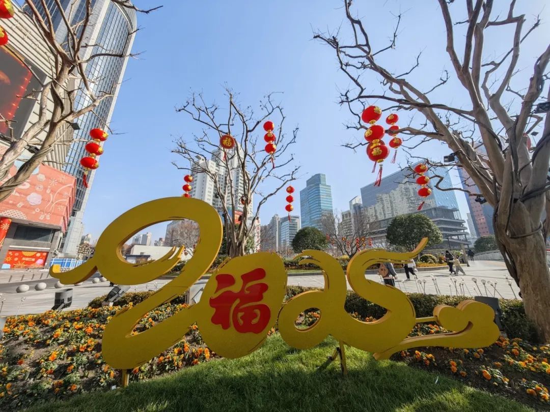 走在徐家汇的街头,随处可见火红的灯笼、大大的中国结、金色的“2025”logo。今年,徐汇区的蛇年景观小品从传统文化中汲取灵感,将生肖“蛇”的元素以相对抽象的形式表现,设计了名为“画蛇添福”的“2025”主题logo,布置在多个绿地中。同时,根据不同造景加入不同材质与大小的灯笼、中国结、福字等传统的新春装饰,融入现代审美趋势,如简约风、国风等,创造出既传统又现代的视觉效果,用logo串联徐汇区绿地的年味。
