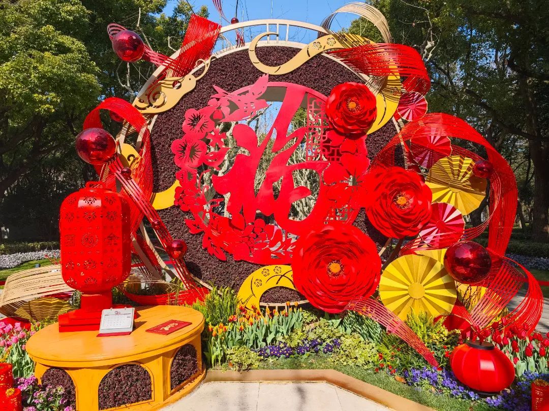 主题造景的主体是一个巨大的圆形装置,中心是醒目的红色“福”字,四周环绕着灵动的蛇形装饰,蜿蜒盘旋,仿佛在舞动,寓意新岁顺遂。大大的红色牡丹簇拥在旁,寓意花开富贵。搭配上传统的红色灯笼,以及周边多彩花卉绿植点缀,整体布置既展现了蛇年的独特韵味,又传递出新春的喜庆与生机,吸引了不少游客拍照留念。
