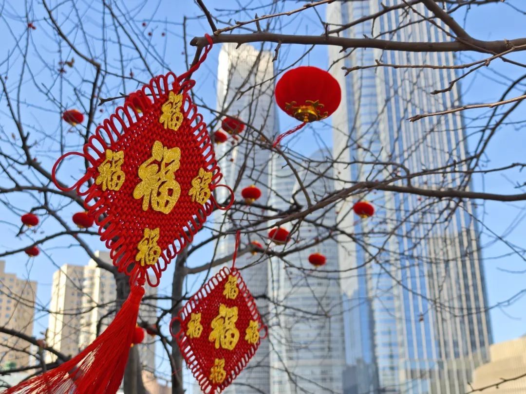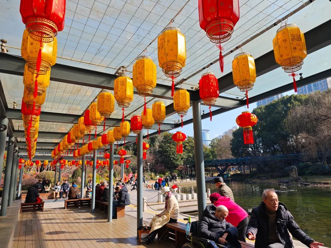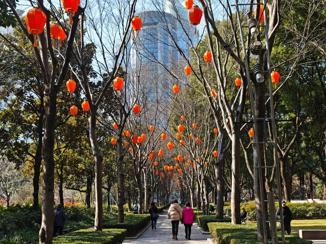 此外,公园在元旦氛围布置的基础上,进一步突出春节传统节日,精心定制了多种样式的国风灯笼,或单独或交错悬挂于枝条、灯杆之上,颜色热烈醒目,为公园增添了一抹亮丽而温暖的色彩。围栏、灯杆上以精美的中国结装饰,造型典雅,寓意着吉祥如意、团结幸福,与红灯笼相互映衬,将浓浓的年味传递给每一位游客。
