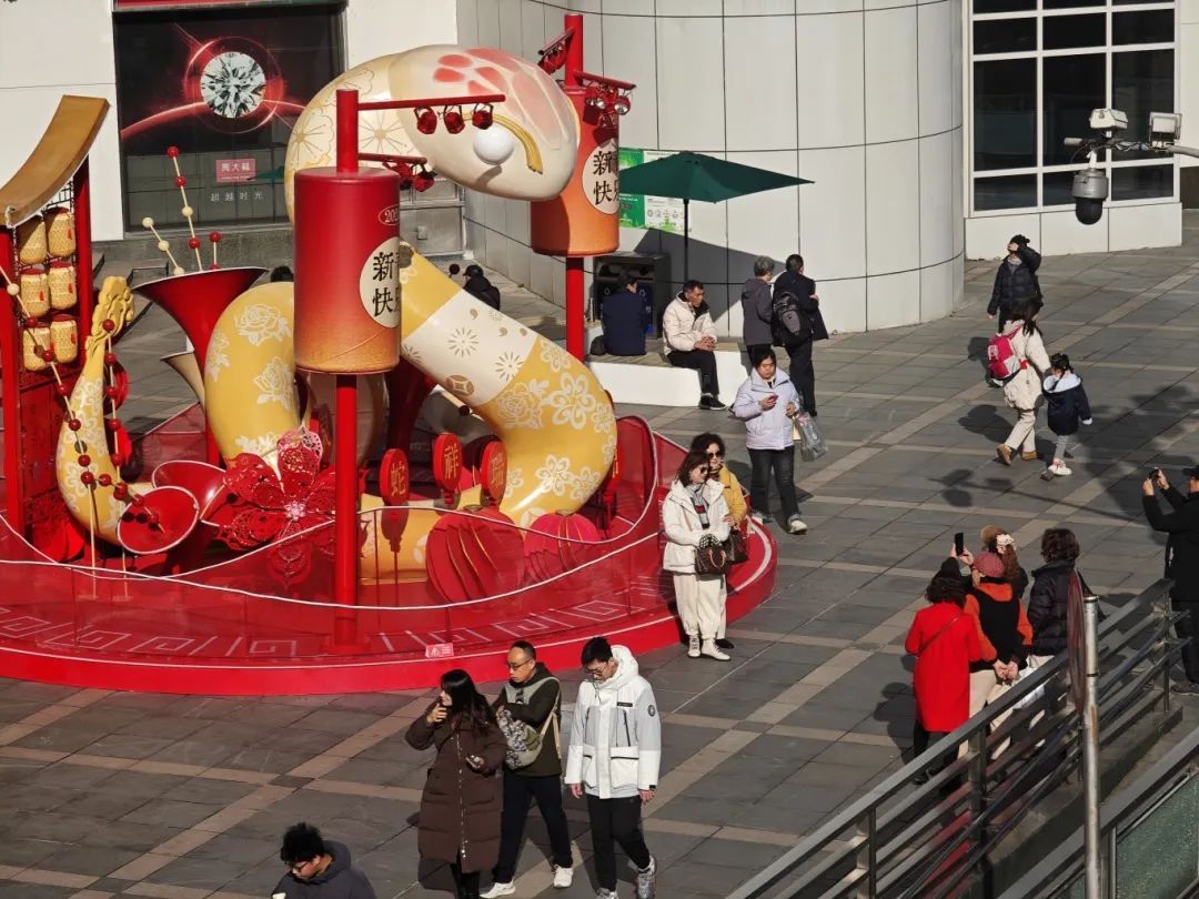 从徐家汇公园步行前往周边商场,举目间尽是春节的气息。汇金百货门前的生肖蛇装置大有来头,它身上交织的图案花纹,出自非遗苏州剪(刻)纸省级项目传承人吴永林大师之手,运用“针刻”“点刻”“片刻”“纹路刻”等多种剪纸技法刻画于蛇身。这些花纹不是简单的装饰,而是一个个流传千年的吉祥符号,寄托着人们对生活的美好愿景。港汇恒隆外广场上,奇巧灯笼现身。蛇影游走于灯身,点亮祥瑞新禧,途经的市民游客纷纷驻足拍照打卡。