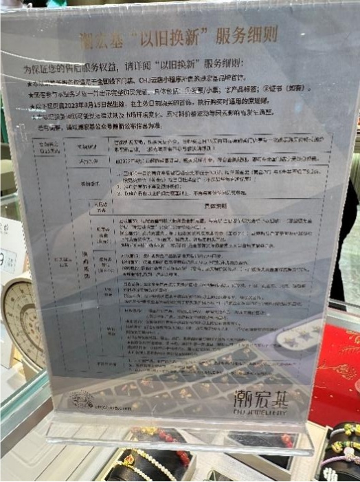 “旧款换新”是消费者比较常见的售后需求,也是众多品牌门店的服务之一。据市消保委对黄金饰品销售门店调查显示,在遇到消费者所佩戴金饰损坏无法修复或因款式老旧想要抵换时,品牌门店一般会为消费者提供两种抵换政策供选择,分别为按黄金克重抵扣和按购入黄金时的成交价抵扣,但无论哪一种抵换方式,都需要为此额外“添金”,“添金”比例为20%-50%。具体可见品牌公示的“以旧换新”服务规则。