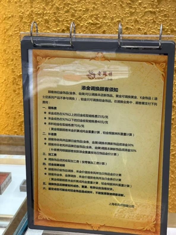 目前,上海老凤祥银楼有限公司旗下门店已将黄金类产品克重都标识在了标签醒目位置,便于消费者一眼就能看到黄金重量,现场还设置了电子天平供消费者复称金重;老庙黄金和亚一金店已将黄金饰品的维修保养及注意事项以台卡的形式放置于柜台醒目位置处,让消费者售后无忧;周大福的销售顾问对黄金饰品工艺优缺点如数家珍,如实相告,主打一个让消费者明明白白按需购买;中国黄金为老牌央企,主营黄金金条,黄金饰品款式也在持续更新,日常促销活动丰富,黄金价格亲民。