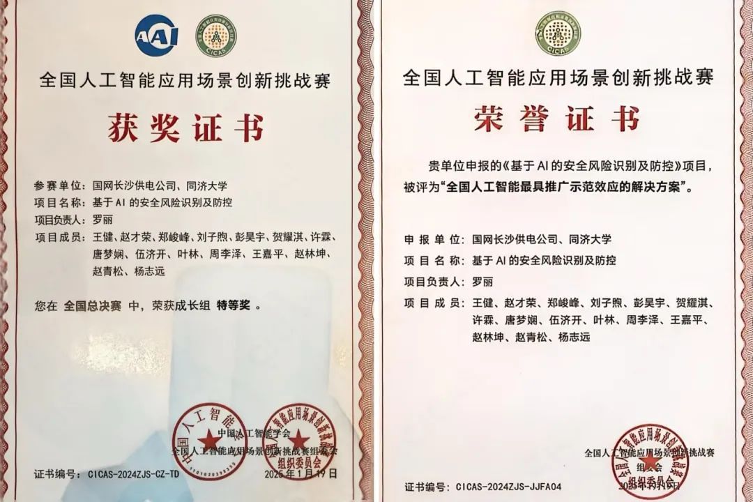 在近日举行的“场景驱动、数智强国”2024第二届全国人工智能应用场景创新挑战赛总决赛暨全国人工智能应用场景创新峰会上,国网长沙供电公司和同济大学计算机科学与技术学院赵才荣教授团队联合参赛项目“基于AI的安全风险识别及防控”荣获全国特等奖(全国特等奖共13项),成为能源领域唯一特等奖作品,并获评“全国人工智能最具推广示范效应的解决方案”。