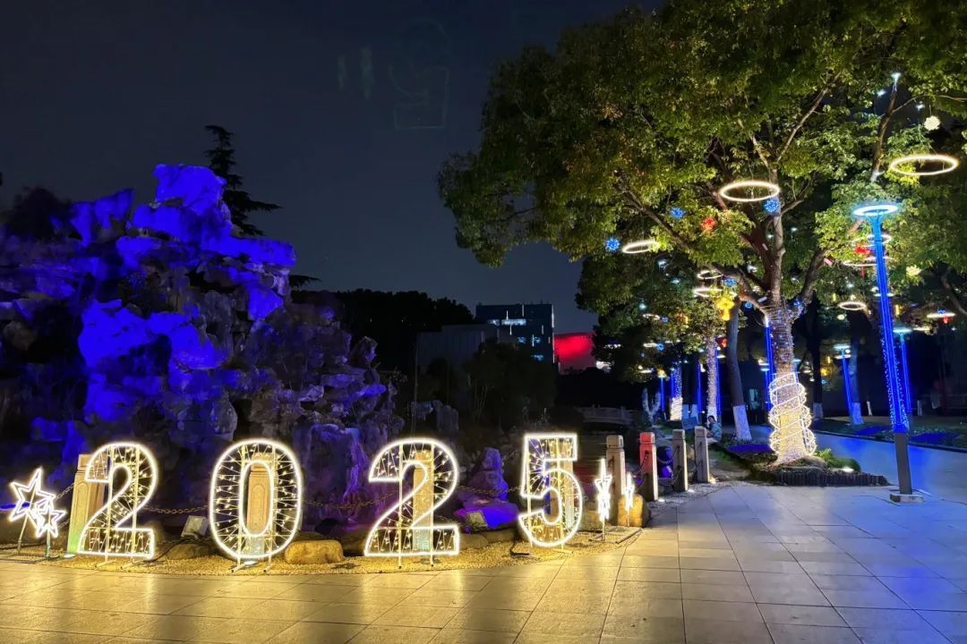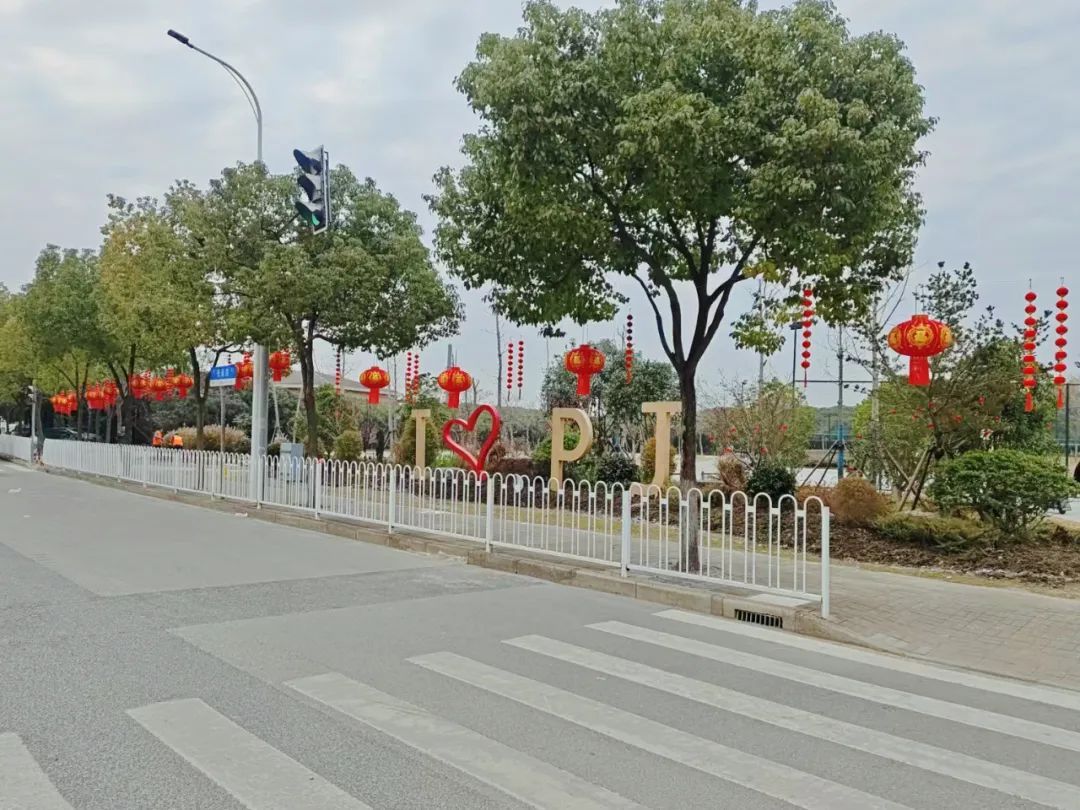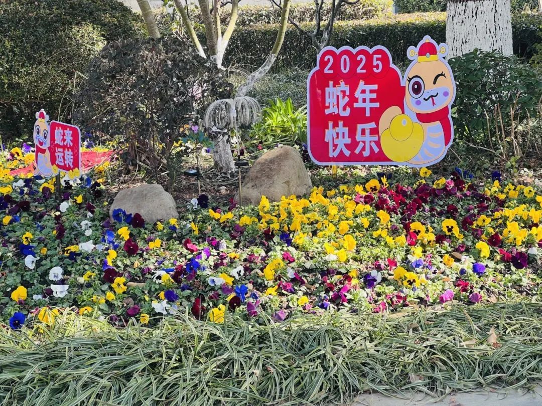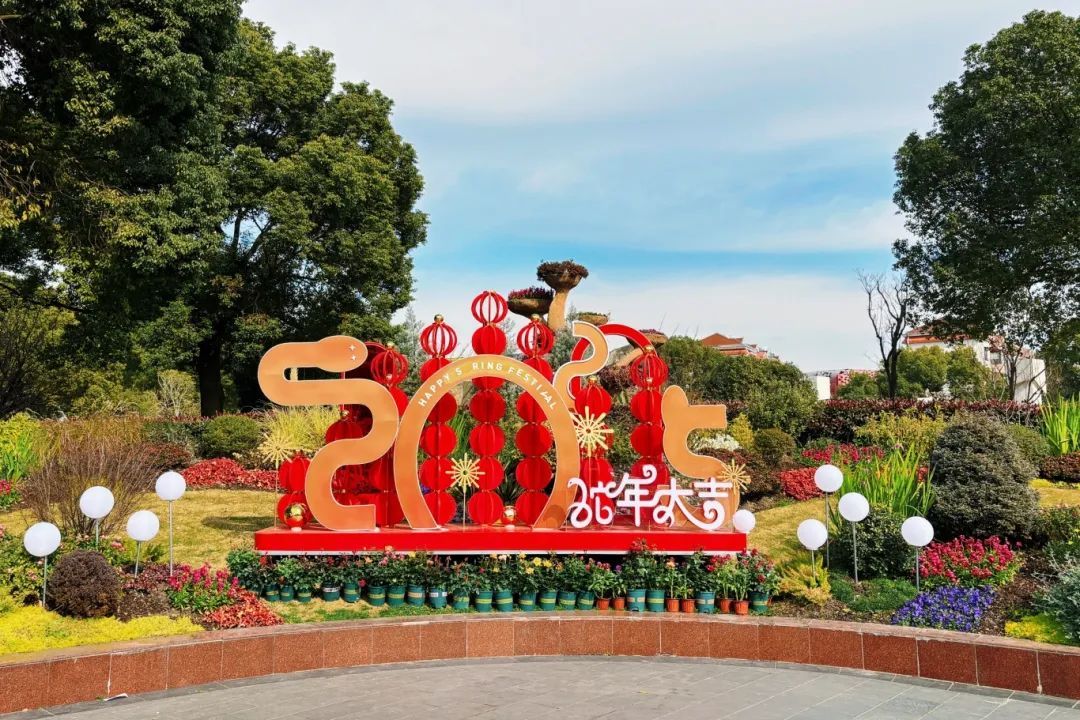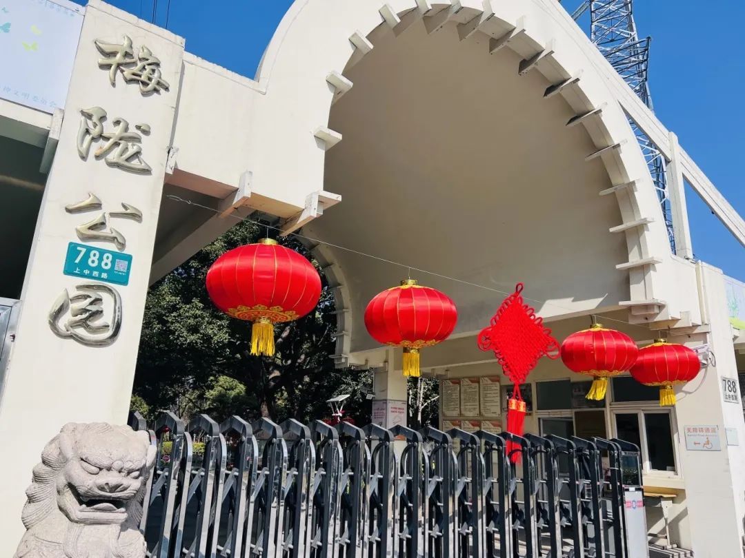 梅陇公园换上新年装!火红的灯笼与中国结高高挂起,小龙宣传牌萌态十足,处处洋溢蛇年喜庆。