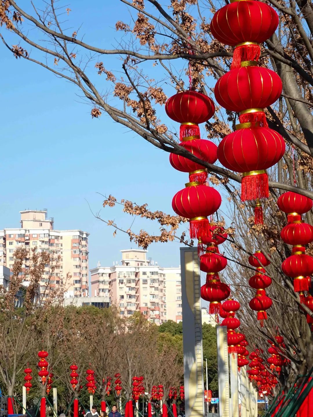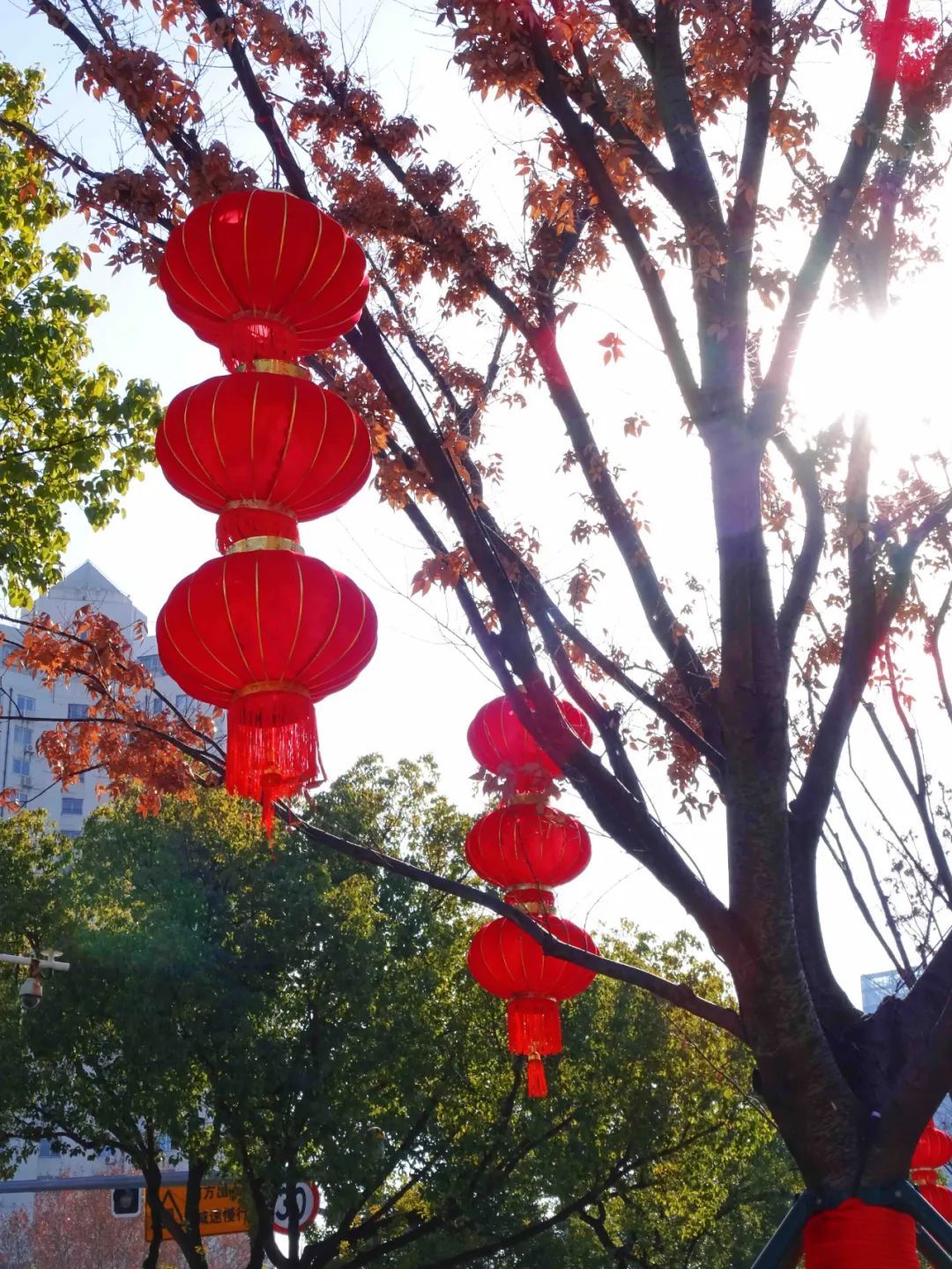 在莘庄镇沪闵公路上,两旁大树的树干披上了一层火红的新装,温馨而喜庆。一串串大红灯笼、一排排福字点燃了路过行人心中对回家的期盼。