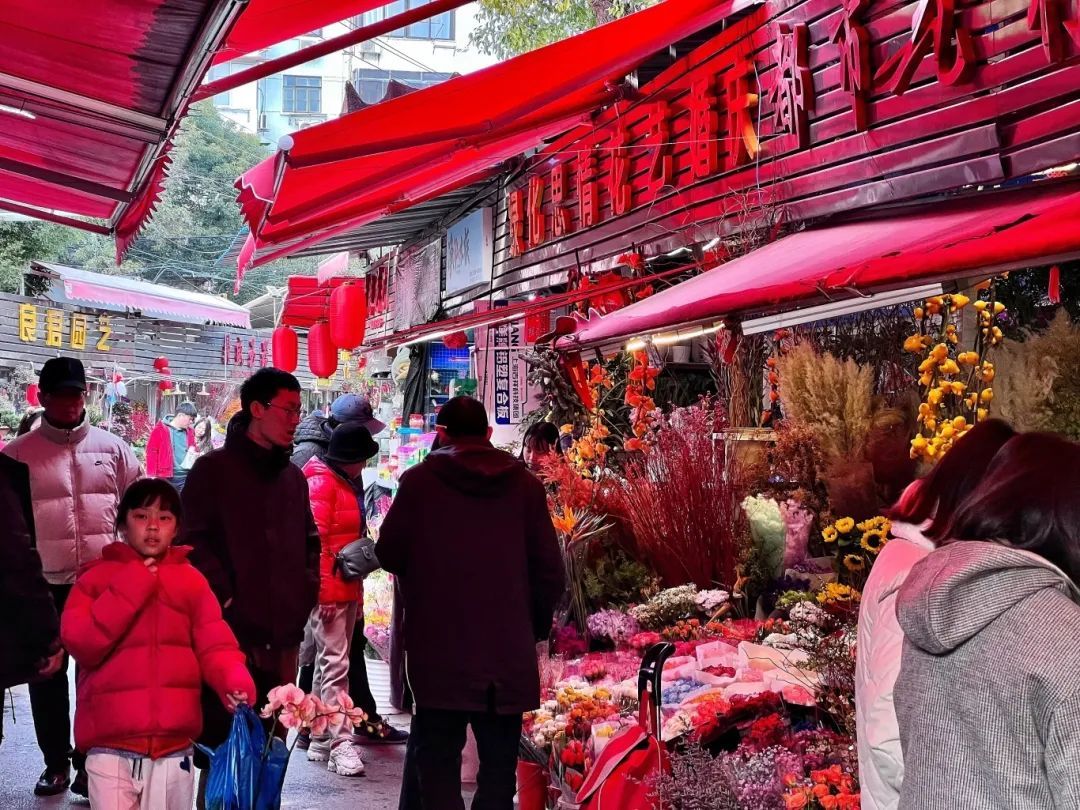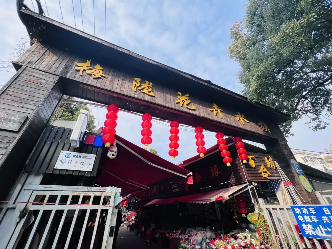 梅陇花鸟市场开启迎春模式,灯笼高悬,红得夺目。一旁的花摊摆满了鲜切花,肆意绽放,花香扑鼻。