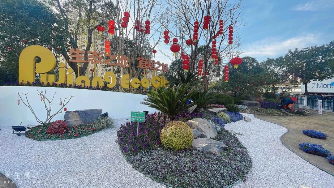浦江镇鲁南路浦星公路东南角通过图案设计、花卉色彩的运用和空间感的营造,将花卉的美感和艺术性相结合。“生态之地,宜居之城”作为整个路口的视觉中心与红色灯笼相得益彰。